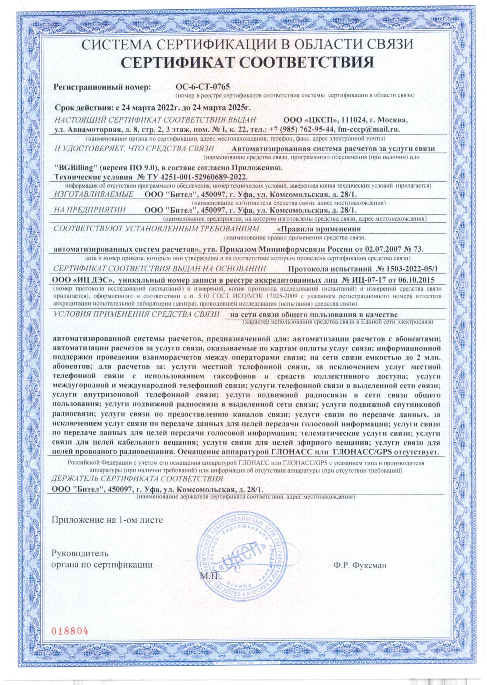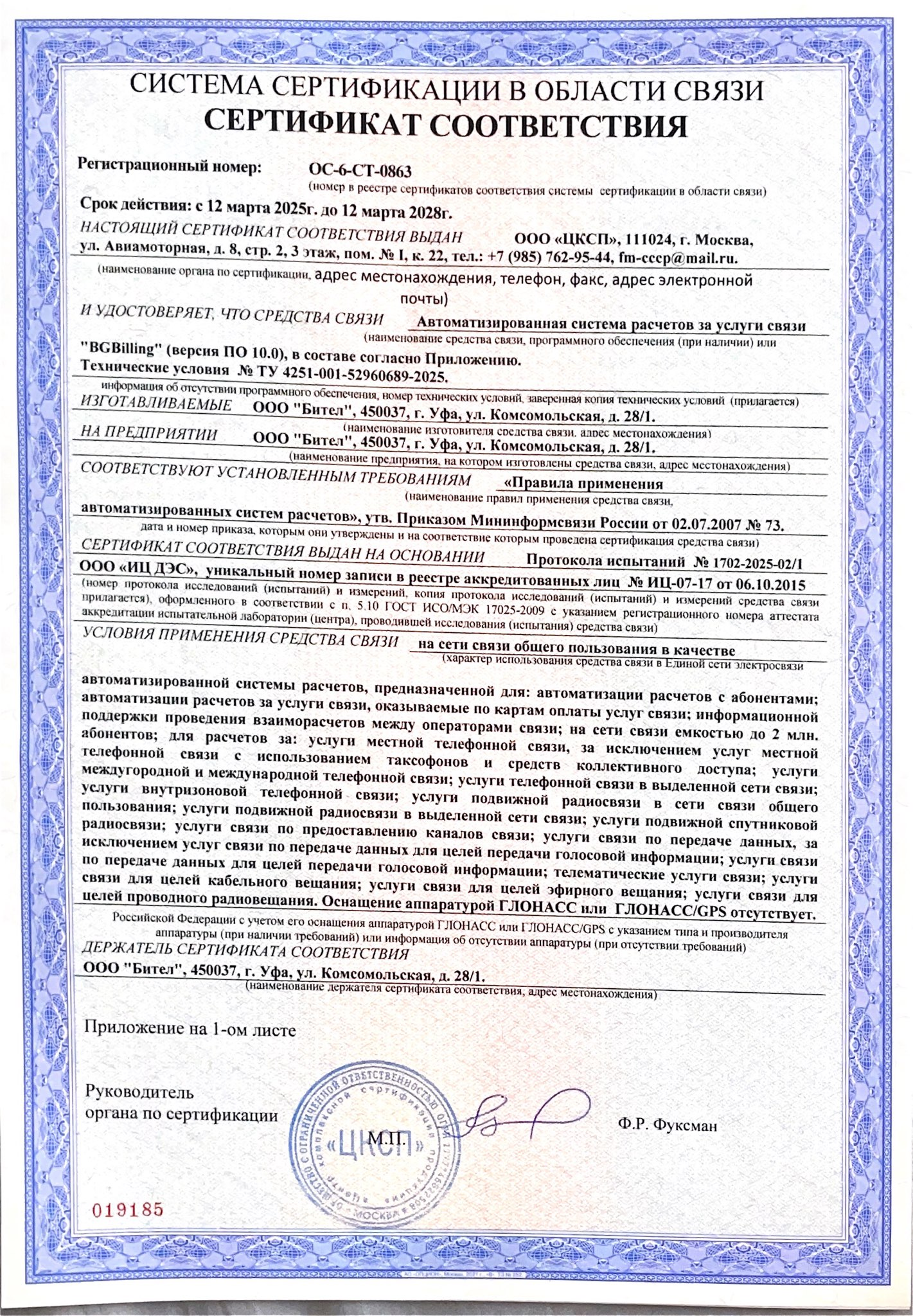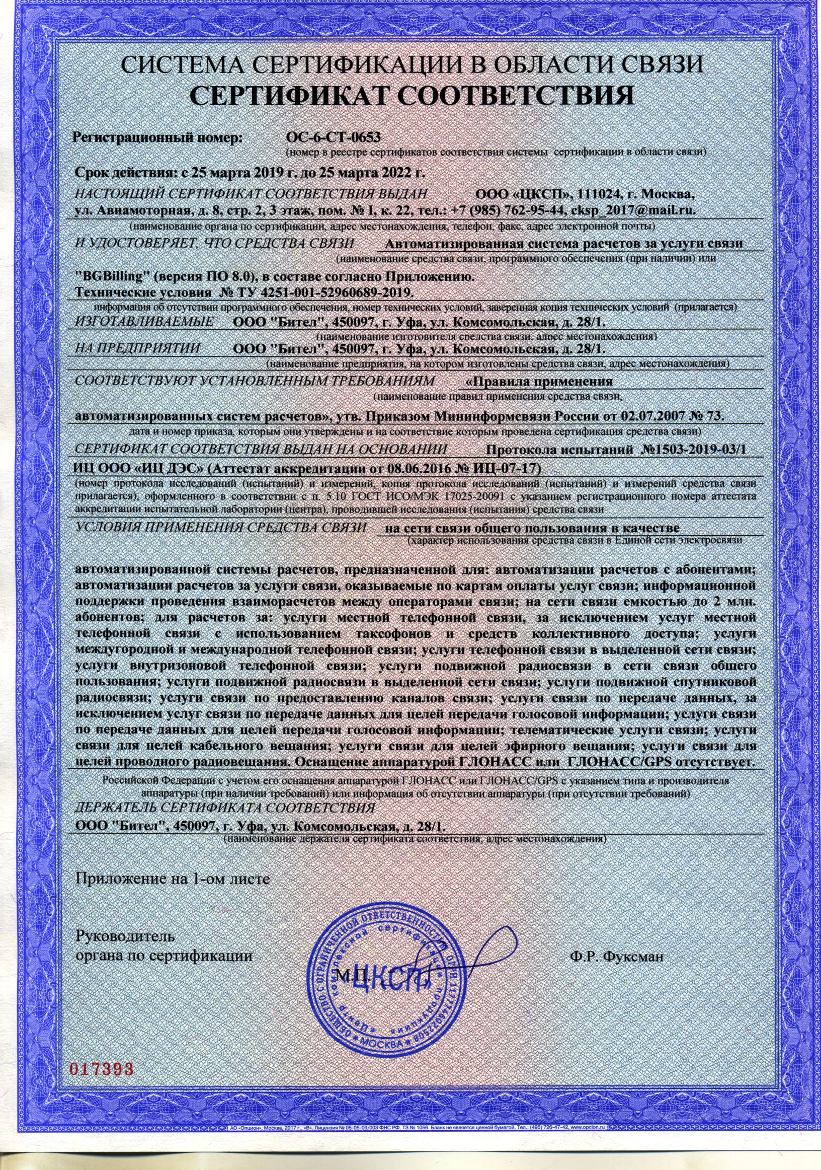 Высочайшая надежность программного продукта BGBilling подтверждена сертификационными испытаниями.