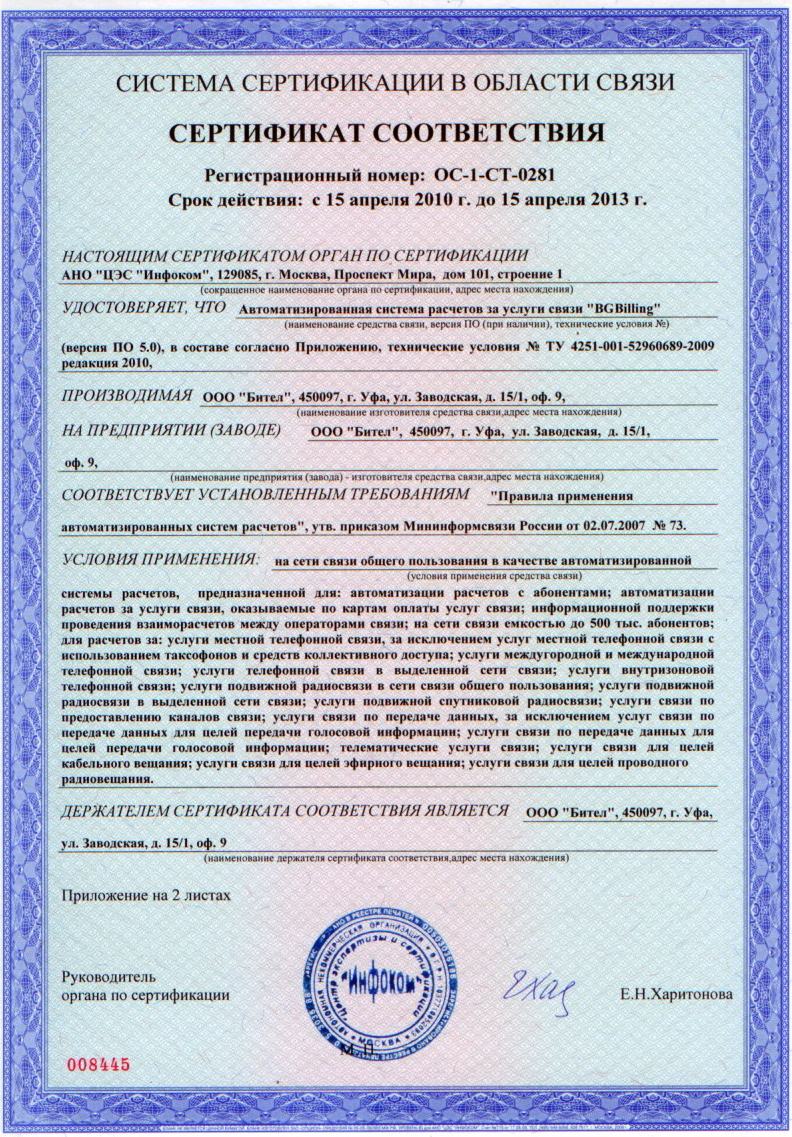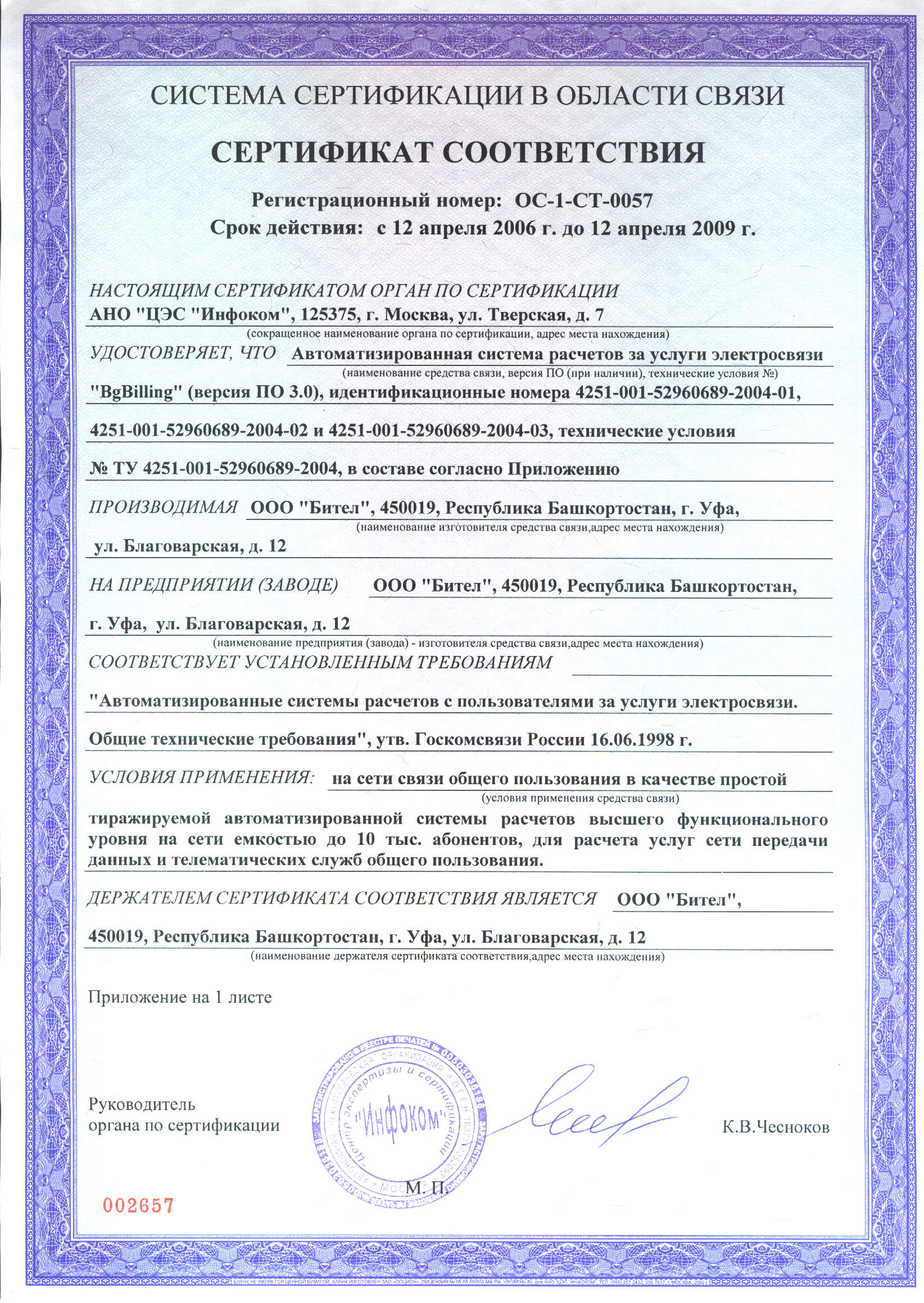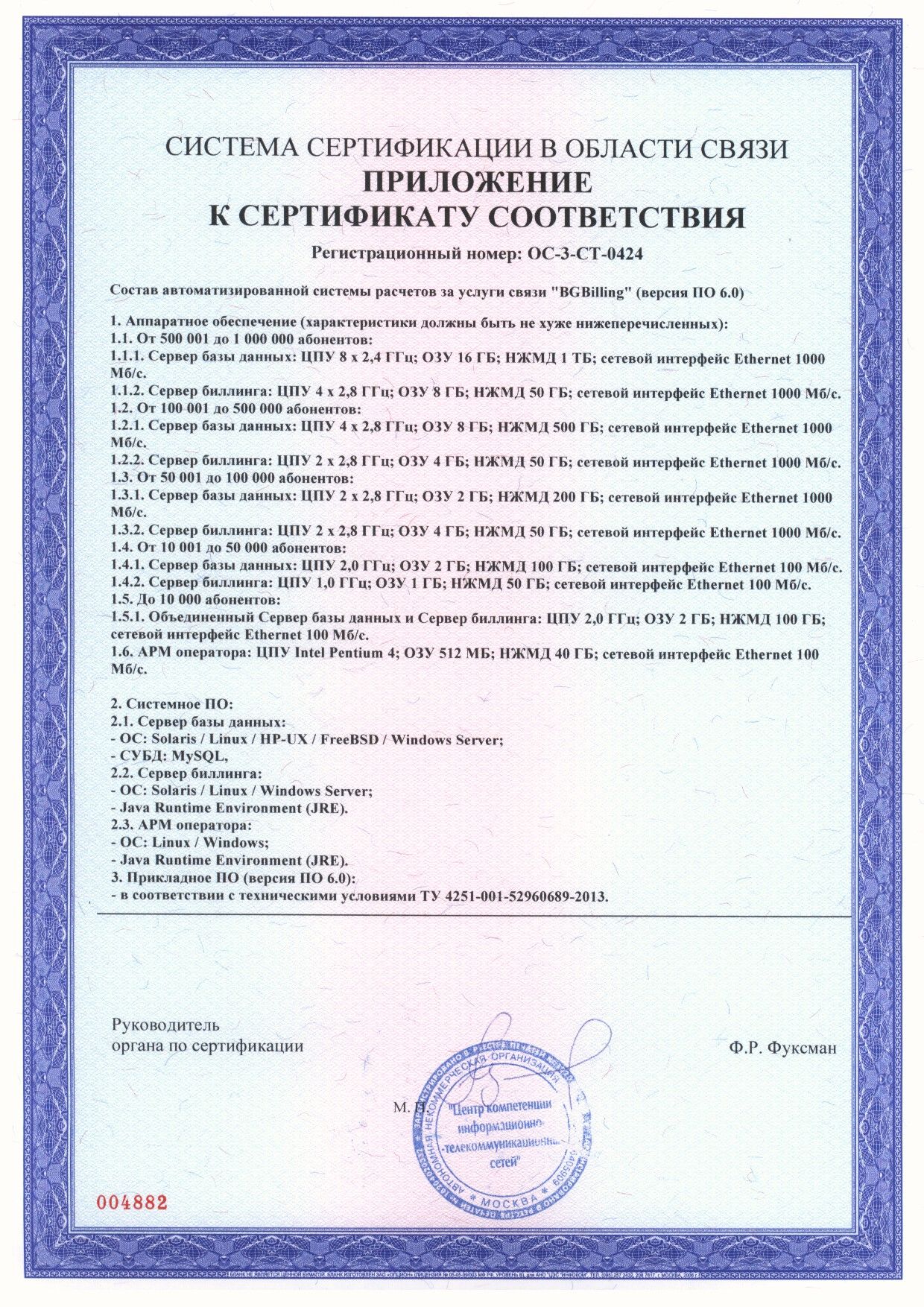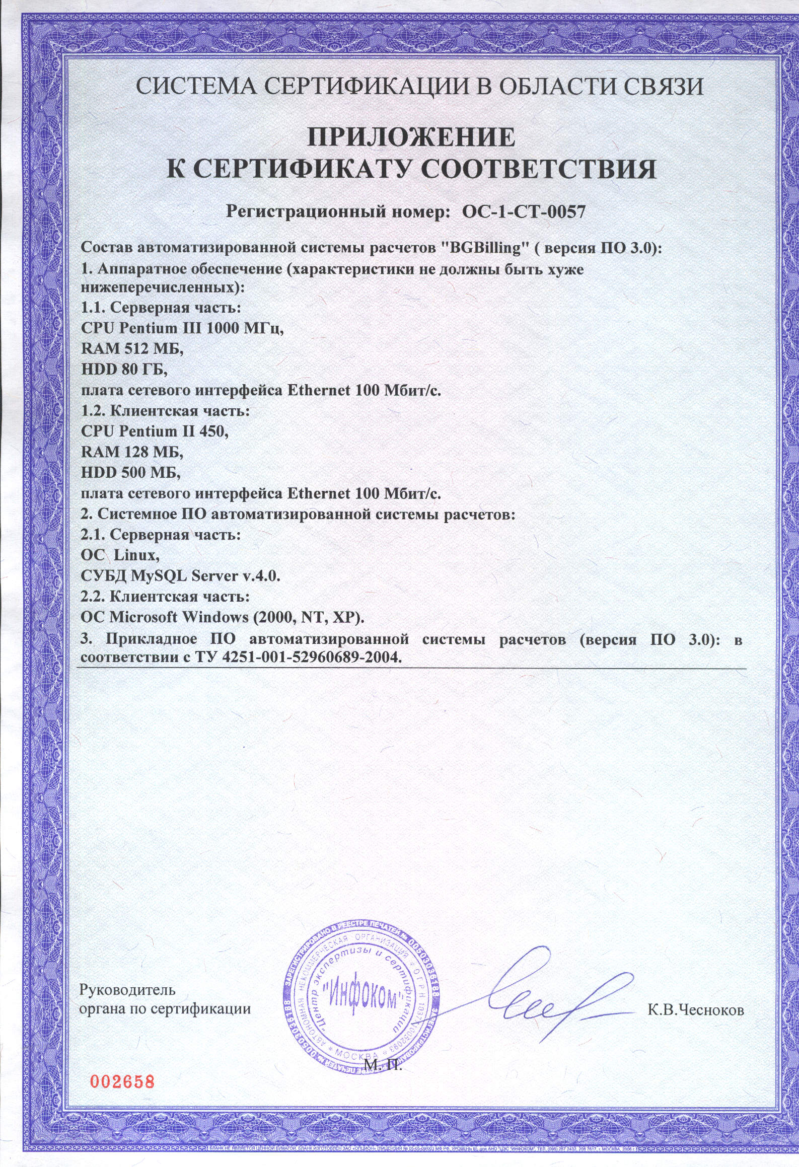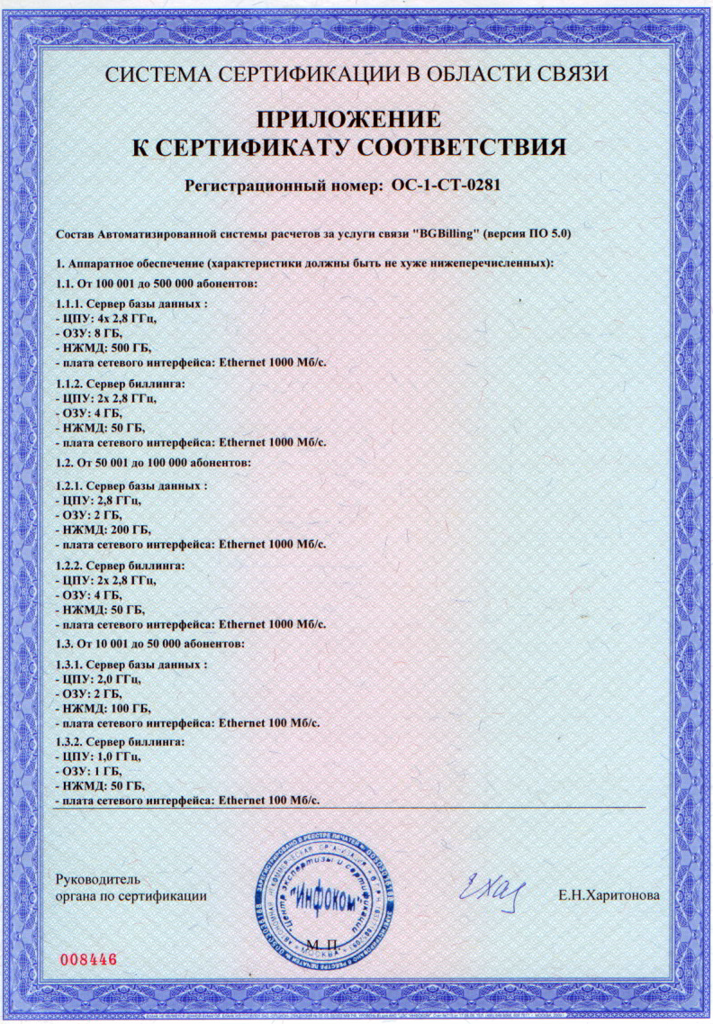 BGBilling 8.х прошла полный цикл сертификационных испытаний, подтвердивших ее соответсвие классу "АСР высшего уровня автоматизации". Предельное количество абонентов увеличено до 2 000 000. Сканированные копии сертификатов представлены ниже.