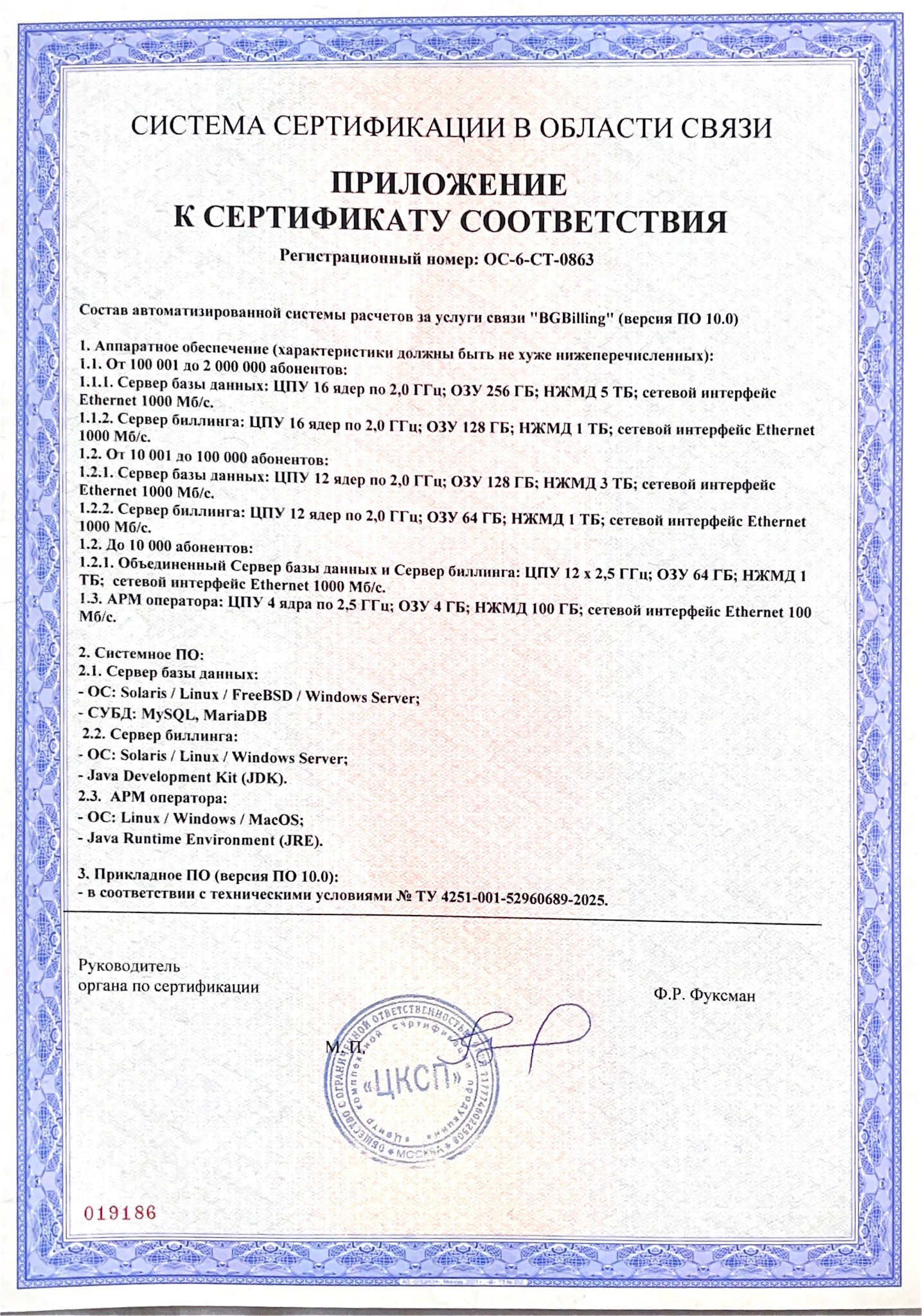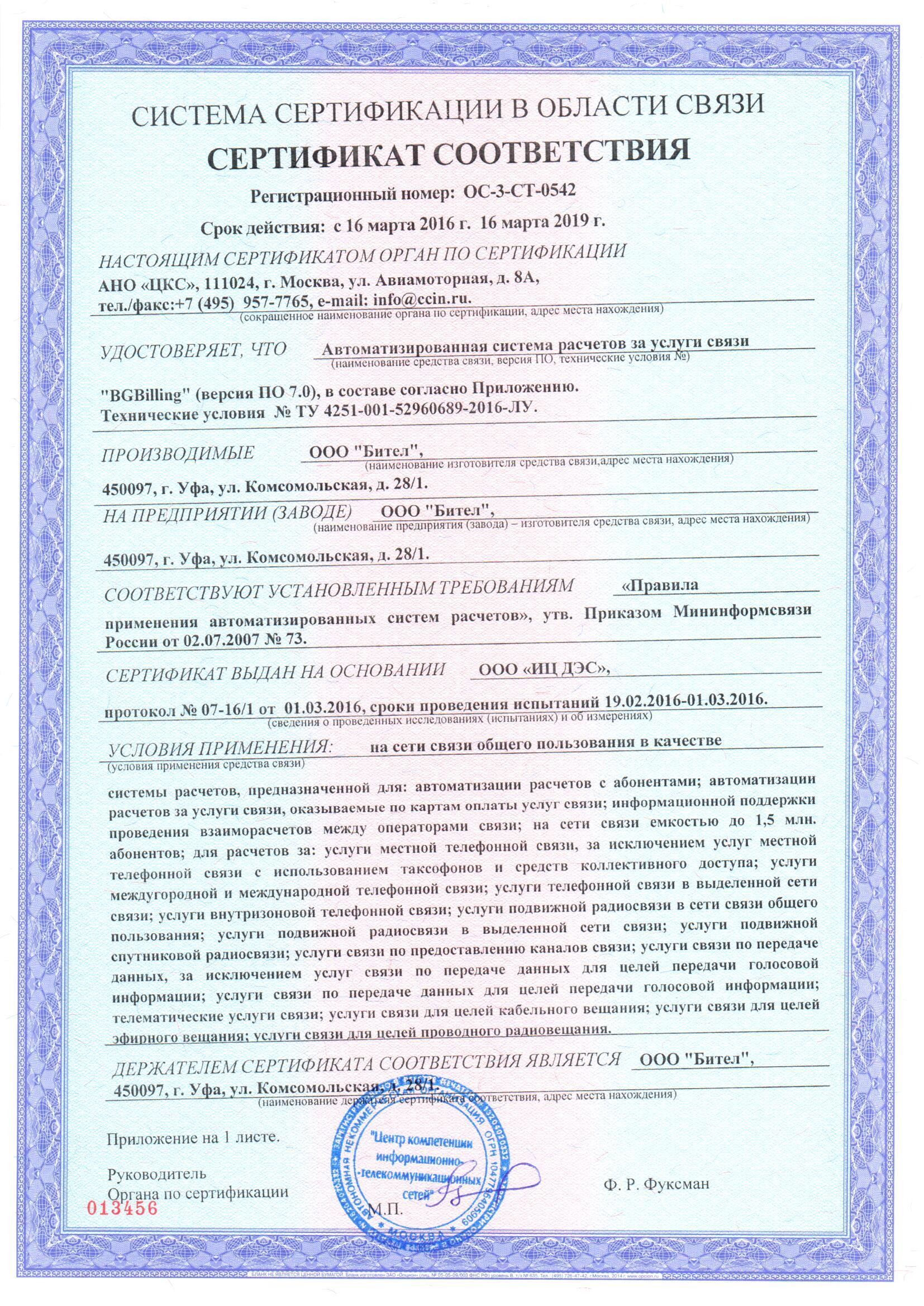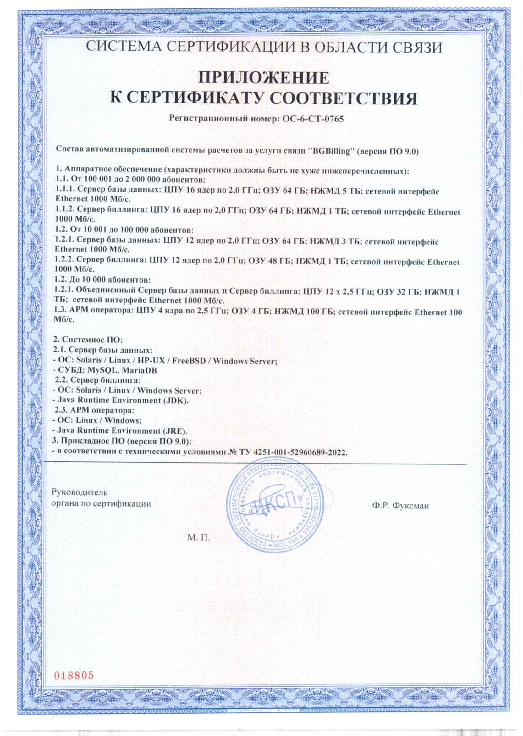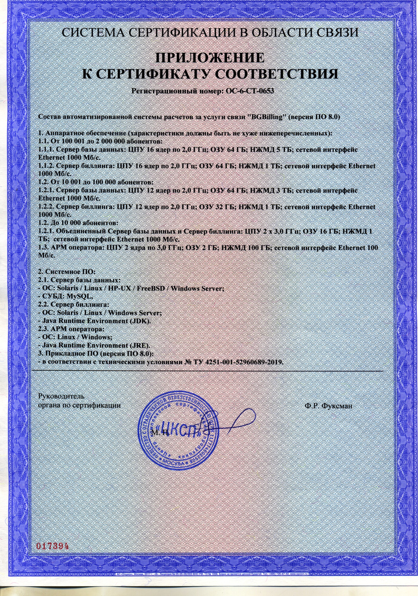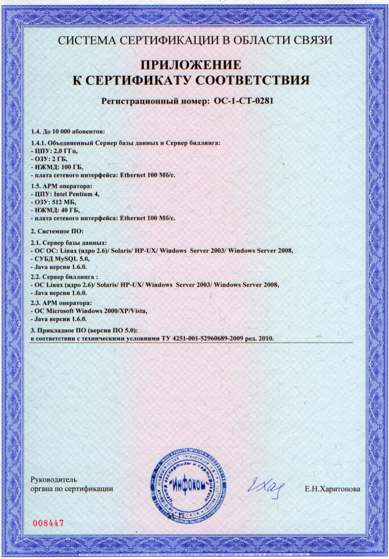 BGBilling 8.х прошла полный цикл сертификационных испытаний, подтвердивших ее соответсвие классу "АСР высшего уровня автоматизации". Предельное количество абонентов увеличено до 2 000 000. Сканированные копии сертификатов представлены ниже.
