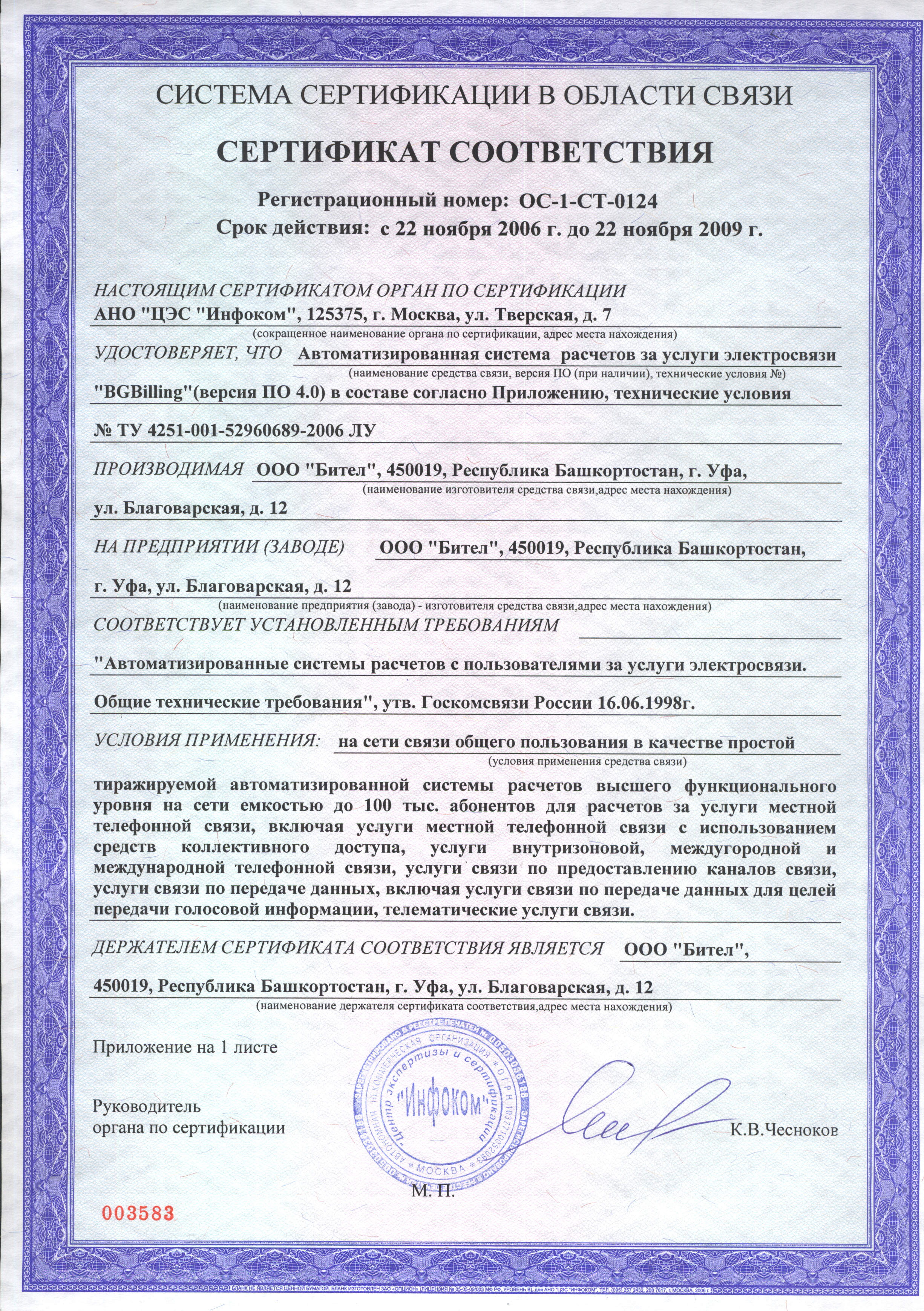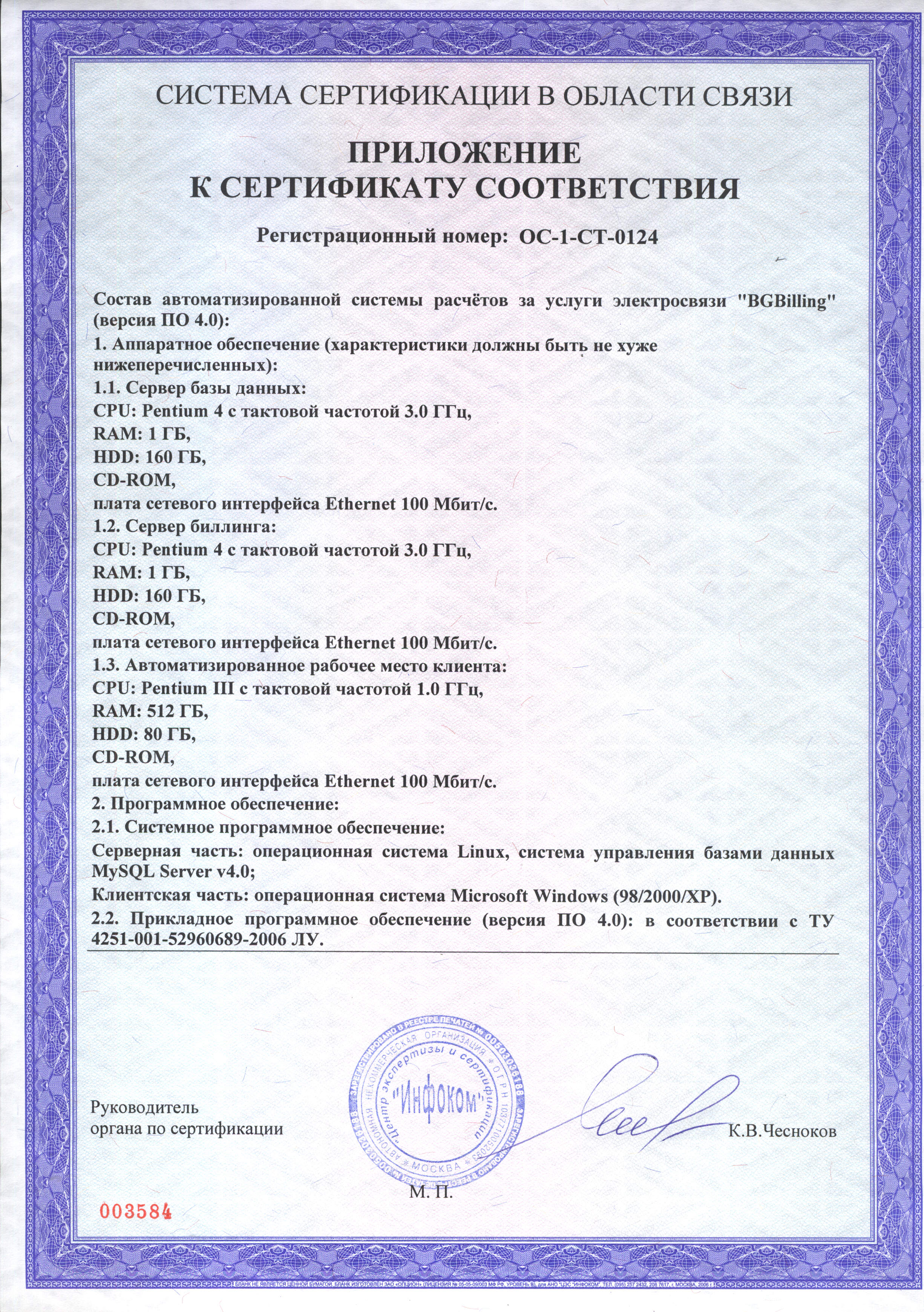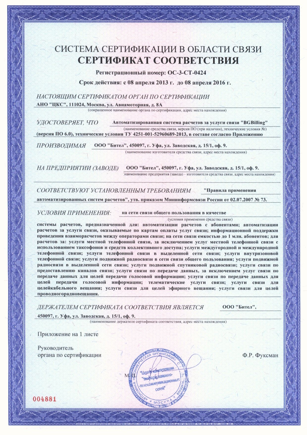 BGBilling 4.х прошла полный цикл сертификационных испытаний, подтвердивших ее соответсвие классу "АСР высшего уровня автоматизации". Радикальное улучшение качества программного продукта по сравнению с предыдущими версиями позволило увеличить заявленное количество абонентов до 100 000 и получить статус тиражируемой системы. Сканированные копии сертификатов представлены ниже.
