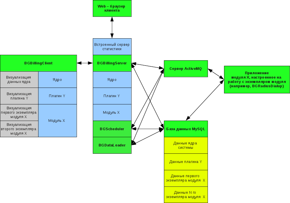 Все приложения, за исключением BGBillingClient, называются биллинга, либо просто биллинга. Связь между всеми серверными приложениями осуществляется через базу данных и сервер ActiveMQ.