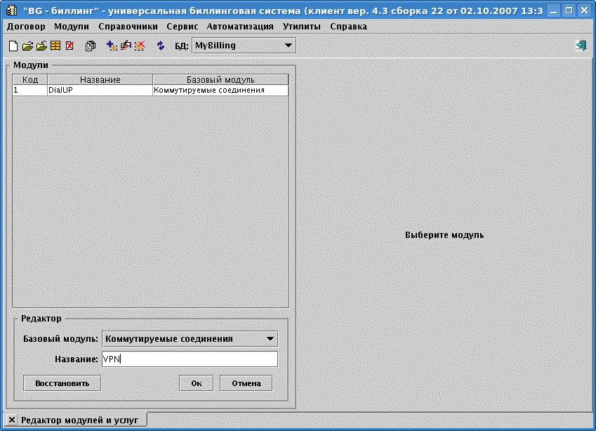 После того, как установили модуль, необходимо перезапустить сервер биллинга. После этого должен быть обновлён клиент. Для этого запустите его и подсоединитесь к обновлённому серверу биллинга.