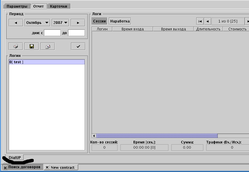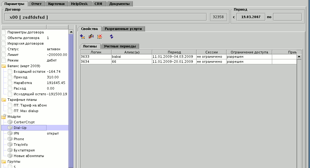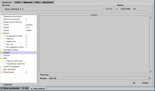 В результате в дереве появится ветка со свойствами модуля для конкретного договора. При её открытии откроется специфичный для модуля редактор. На снимке экрана это редактор логинов DialUp-модуля.