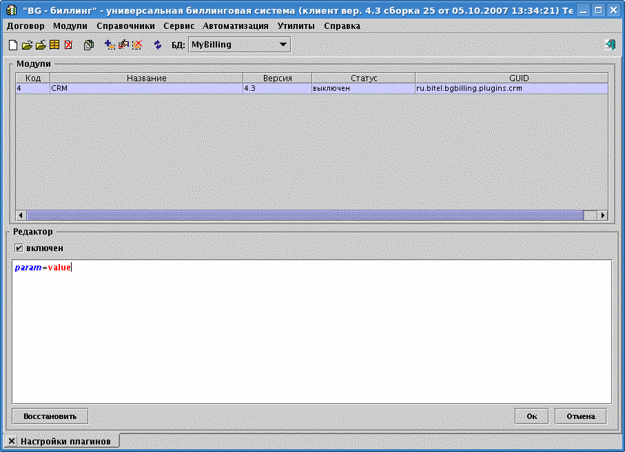 Установка плагинов не отличается от установки модулей, также используется утилита (см. предыдущую секцию документации). После инсталляции плагина перезапустите сервер биллинга и зайдите в клиенте в меню .