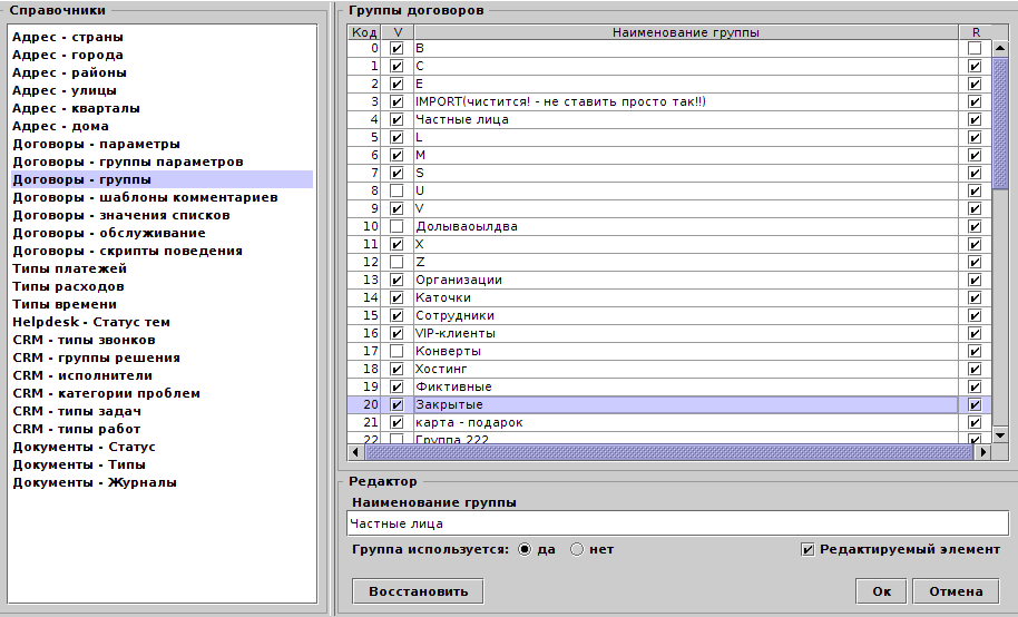 Для того, чтобы убрать группу у всех договоров, необходимо в справочнике групп выбрать группу, нажать правой кнопкой мыши и в появившемся меню активировать пункт . Признак определяет видимость группы в редакторе в договоре и во всех фильтрах поиска.Признак означает то, что помеченные группы вручную можно устанавливать/убирать в договоре.