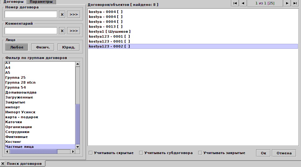 Поиск можно осуществлять по названию и комментарию с фильтром по группам и типу лица, либо по параметрам договора. При поиске по названию договора, либо комментарию следует набрать маску поиска и нажать или клавишу . Маска поиска - подстрока, входящая в искомое значение. Кнопка - отмена поиска, сброс значения. - запуск поиска.