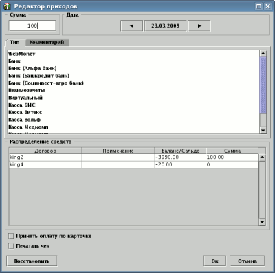 Независимый субдоговор имеет свой собственный баланс, его приходы/расходы/наработка отделены от супердоговора. Субдоговоры с независимым балансом позволяют разделять несколько видов сервиса для одного клиента, каждый из которых блокируется отдельно и имеет свой счет. При занесении прихода в супердоговор с независимыми субдоговорами возможно произведение распределения прихода по супердоговору и независимым субдоговорам. По умолчанию сначала гасится задолженность супердоговора, затем поочередно субдоговоров. Распределение суммы может быть скорректировано в таблице.