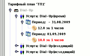 В период можно помещать также секции тарифного дерева, регулируя, когда отрабатывает тот или иной блок. В приведенном ниже примере с 1 сентября увеличивается объем предоплаченного трафика в тарифе модуля DialUp.