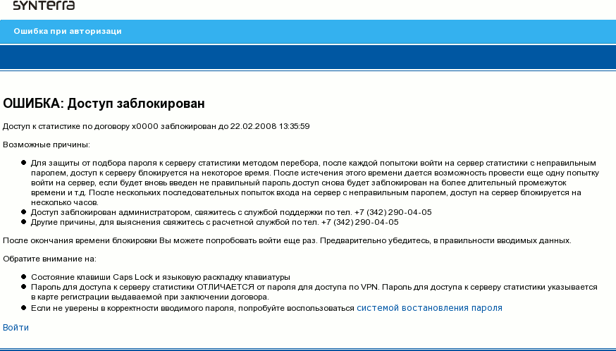 При ошибке авторизации отображается страница, задаваемая шаблоном . Скорректируйте в данном шабkоне номер телефона вашей техподдержки. Если вы используете дополнительные режимы авторизации кроме договора, скорректируйте выводимый текст.