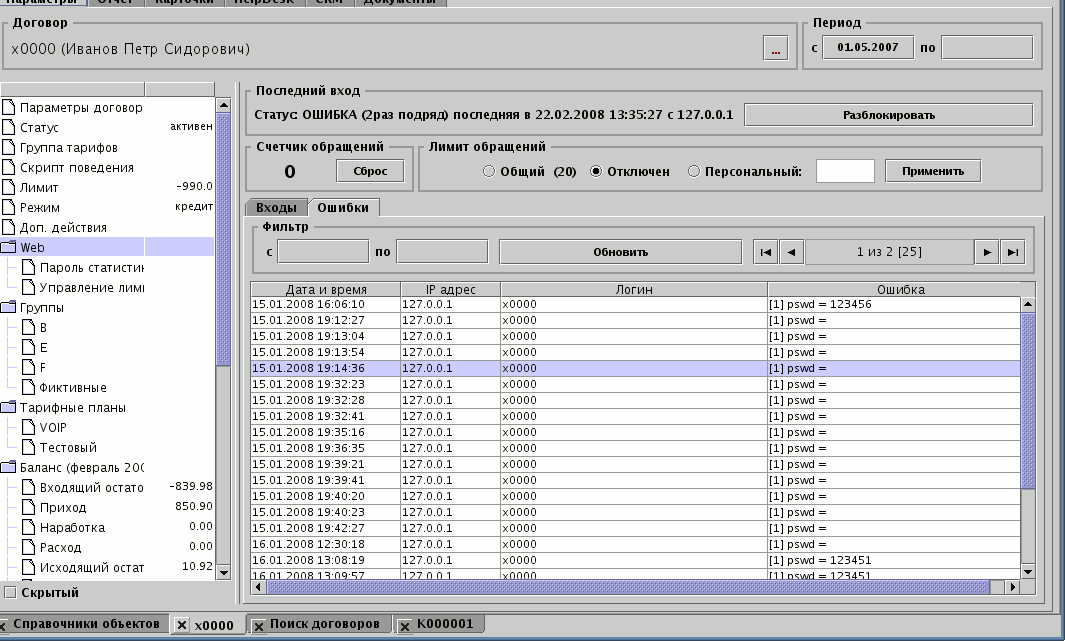 Временные характеристики защиты могут быть настроены в конфигурации сервера. Переменная задает максимальное количество неудачных попыток авторизации для договора подряд. После каждой попытки может быть установлен таймаут, базовый размер которого определяется переменной . После первой неудачи таймаут равен периоду, после второй - двум периодам, затем трем и т.п. Алгоритм увеличения периода задается переменной . После исчерпания попыток авторизации договор блокируется на время секунд.