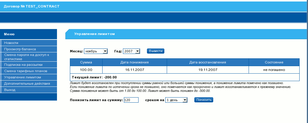 Для управления лимитом используется меню на странице статистики. Для понижения лимита выбирается сумма и на сколько дней необходимо понижение. В случае, если договор не входит хотя бы в одну из групп, указанных в конфигурации, для которых доступно понижение лимита или если режим договора не , меню не отображается.