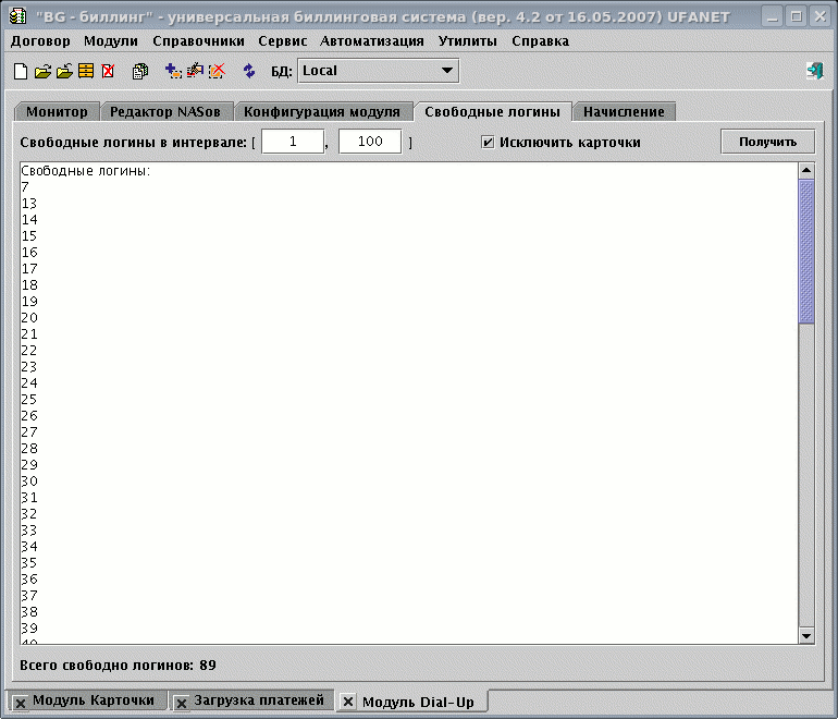 При активации карты для создания договора и логина логин и пароль карты преобразуется в логин и пароль модуля DialUP, либо модуля VoiceIP. Использовать данный логин для новый карты повторно можно только после того, как логины в модуле DialUP/VoiceIP будут освобождены и договоры удалены. Для проверки свободных логинов во всех модулях интегрирующихся с модулем карт есть вкладка .