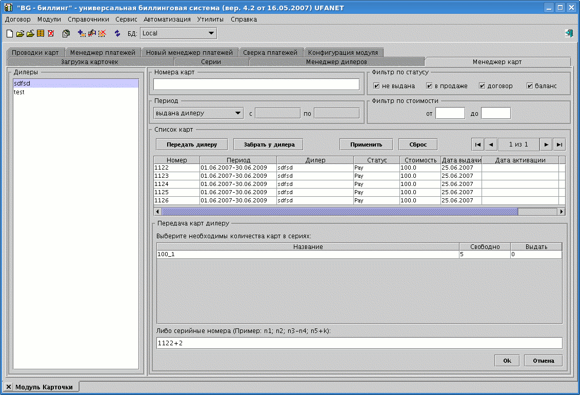 При передаче карт можно указать как количество карт выдаваемое из каждой серии (отображаются только не пустые серии), так и перечислить серийные номера карточек. При перечислении можно использовать следующие конструкции, разделённые точкой с запятой: