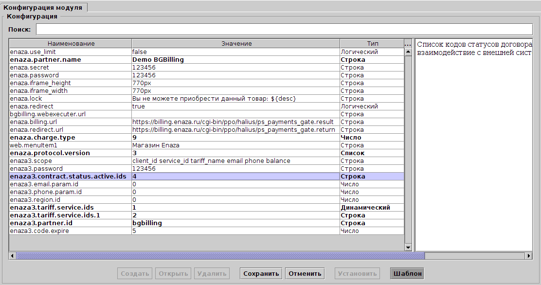 На вкладке создайте и установите конфигурацию модуля. Список опций доступен в редакторе конфигурации при выборе режима ШАБЛОН. Опции можно разделить на три группы. Первая группа общие опции для 2 и 3 версии протокола. Вторая группа - опции для 2 версии протокола. Третья группа - опции для 3 версии протокола (начинаются с префикса enaza3).