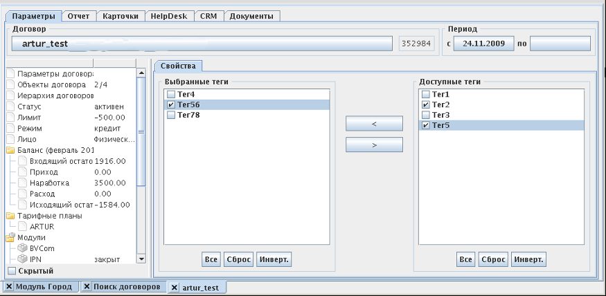 Подключите экземпляр модуля к договору. Слева в дереве договора в разделе появится экземпляр модуля. Выберите его. Справа появится возможность привязки тегов к договору.