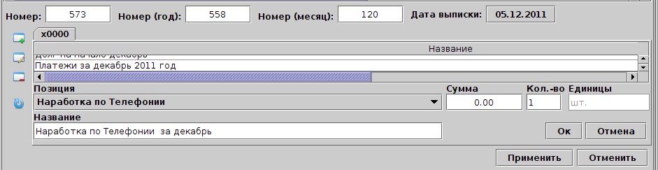 Вы можете скорректировать все три порядковых номера, на основании которых формируется номер документа (абсолютный порядковый, в году, в месяце), дату выписки и позиции документа. Редактирование позиций идентично тому, что производится при генерации документов. При сохранении документа с уже занятыми номерами абсолютным в году, либо в месяце выводится предупредительное сообщение, однако сохранение номера производится.