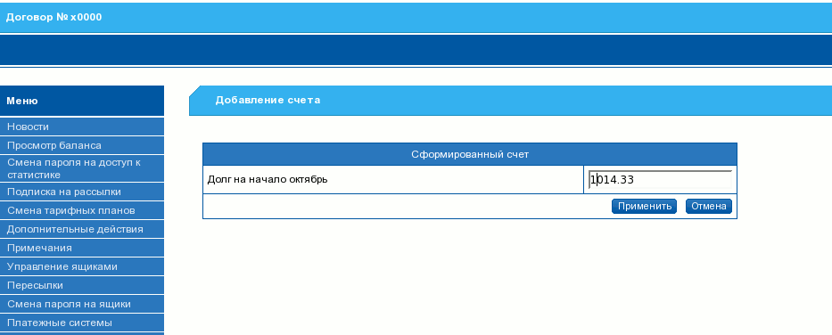 Пользователь может скорректировать сумму счета. Разумеется, самостоятельное создание счетов разрешается только для договоров, работающих по предоплате.