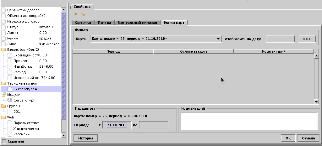 Возможно контролировать копии карт. Копии карт реализуют логику наличия нескольких одинаковых карт у клиента. Контроль за их количеством позволяет правильно тарифицировать наличие нескольких карт. Если у клиента есть карта и копия, то они будут тарифицировать как 2 карты и нароботка будет удваиваться. На вкладке "Копии карт" отражаются карты в выпадающем списке и копии к ним в таблице. Для добаления, редактирования и удаления используются стандартные кнопки. Для добавления новой копии, необходимо выбрать основную карту в выпадающем списке и нажать кнопку . Срок действия копии ограничен сроком действия основной карты. Тарифицируются копии с даты начала по дату окончания действия включительно.