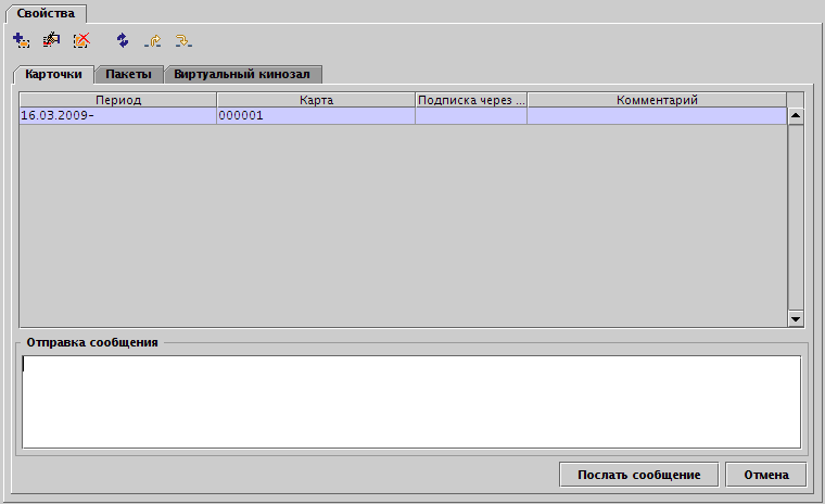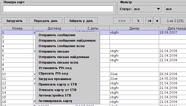 - отправка сообщения на клиентский STB (SetTopBox), привязанный к выбранной (первой из выбранных) карточке. - отправка сообщения на STB, привязанным к карточкам, найденным по указанному фильтру, т.е. карточкам с первой по последнюю страницу. - отправка сообщений всем карточкам.