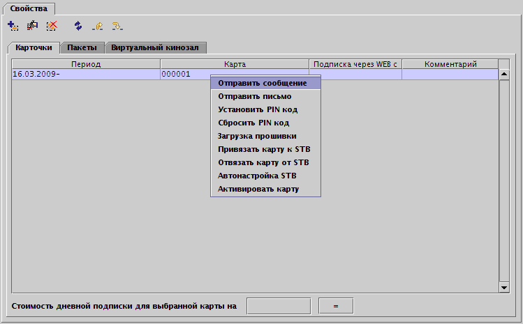 В менеджере карт, а также на закладке Карточки в договоре в параметрах модуля доступно контекстное меню. Irdeto Pisys позволяет отправлять сообщения/письма, устанавливать/сбрасывать PIN(родительский) код,