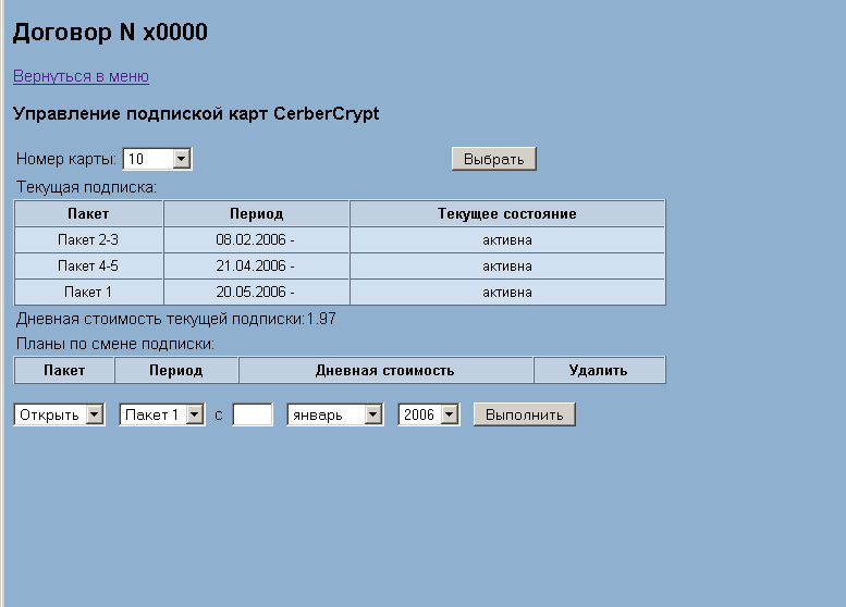 Через Web интерфейс пользователю предоставляется текущая подписка его карт. При разрешении администратором пользователь может устанавливать задания на смену подписки с определённой даты.