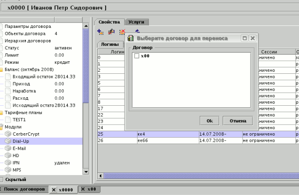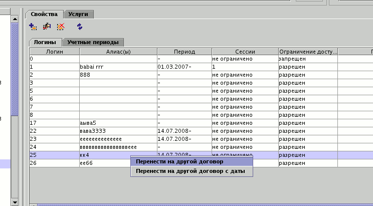Пункт переносит логин из одного договора в другой (карточка должна быть открыта в текущий момент), при этом перемещается и вся наработка по данному логину. При переносе переносится наработка по логину только на период действия логина.