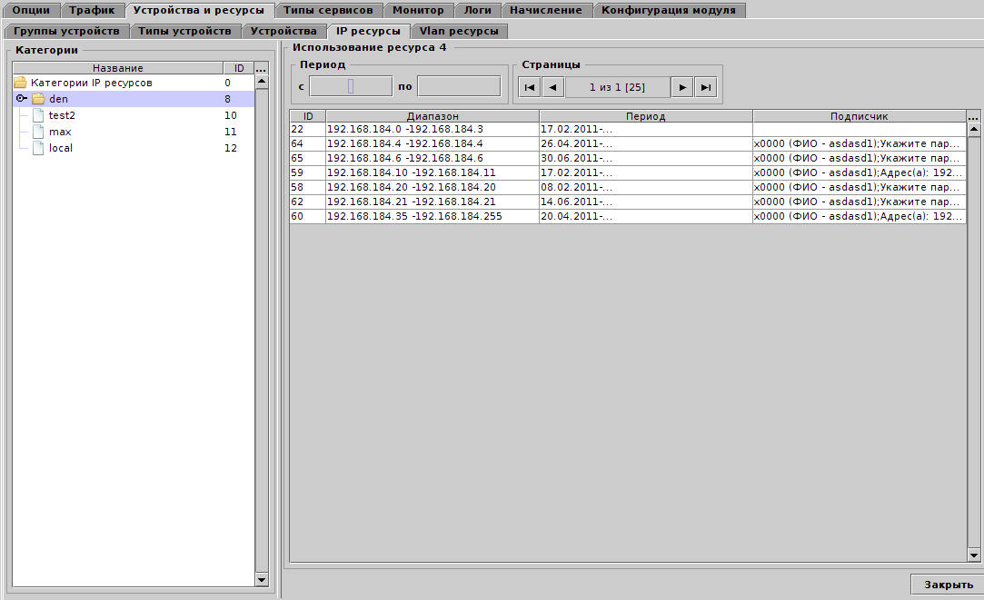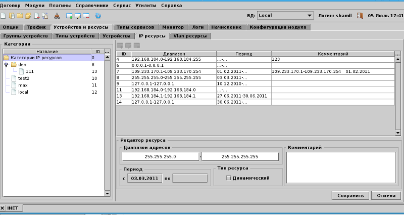 Для редактирования дерева категорий используется общая панель инструментов, для редактирования ресурсов - панель над таблицей с ресурсами. Каждый диапазон адресов уникален внутри категории.