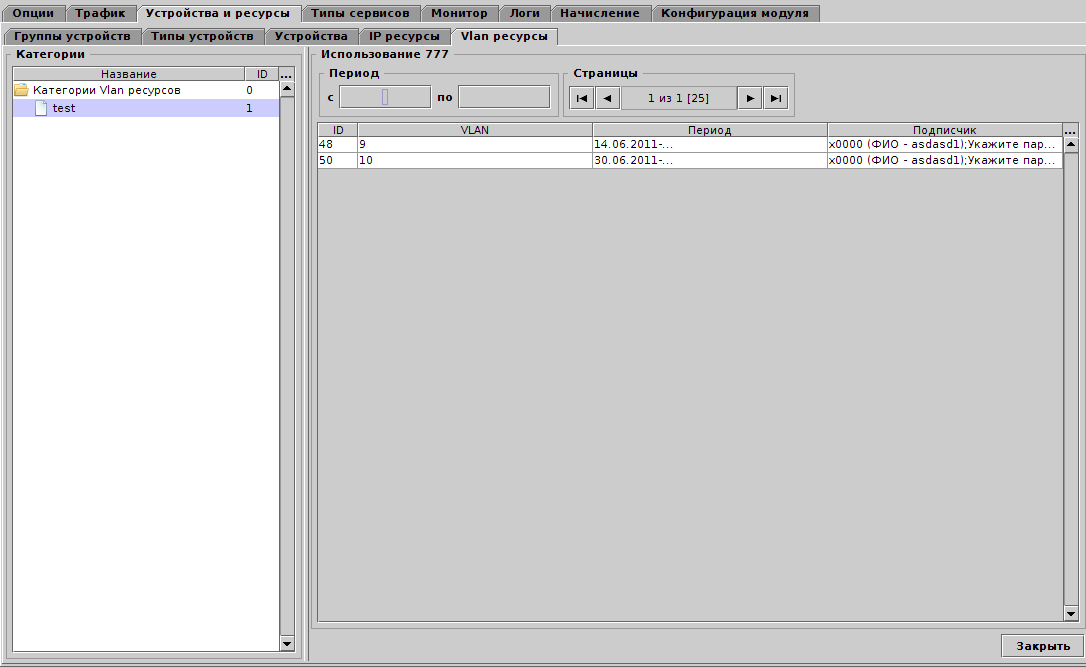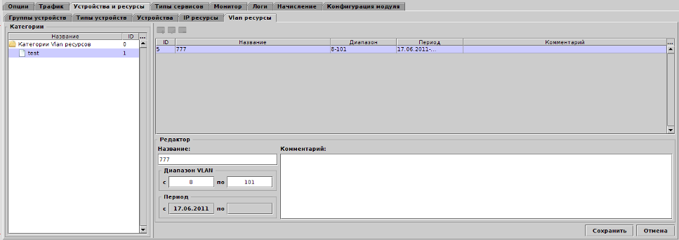 Для редактирования дерева категорий используется общая панель инструментов, для редактирования ресурсов - панель над таблицей с ресурсами. Каждый диапазон VLAN уникален внутри категории.