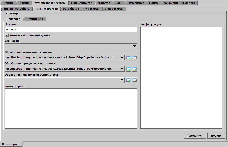 На вкладке типа устройства указываются его интерфейсы, к которым могут быть привязаны сервисы. Например, это могут быть порты коммутаторов.