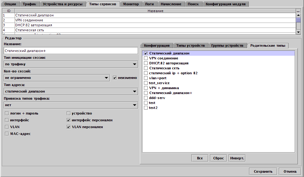Если же выделен сервис, у типа которого есть дочерние типы (т.е. те, у которых указан родительский тип, тот же что и тип выделенного сервиса), то в редакторе будут доступны для выбора только эти дочерние типы и сервис после сохранения добавится как дочерний к тому, что был выделен перед добавлением.