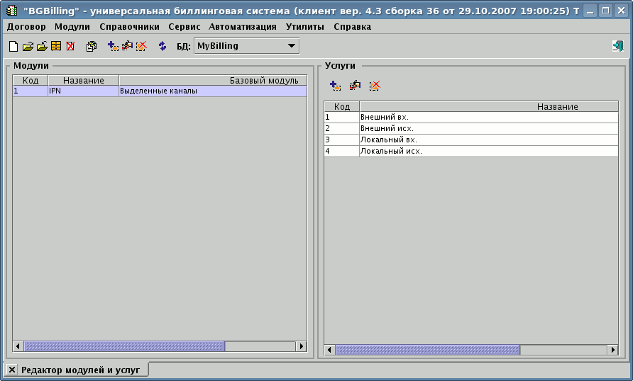 После инсталляции модуля, создания его экземпляра в необходимо завести услуги, определяющие типы трафика в модуле. Например: IPN внешний входящий, IPN внешний исходящий, IPN локальный входящий, IPN локальный исходящий.