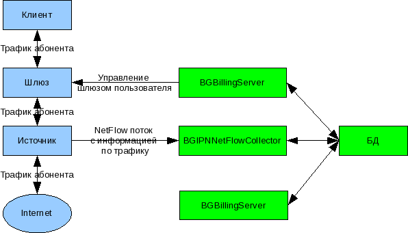 Функция источника - предоставление информации о трафике абонента посредством передачи NetFlow-потока на коллектор модуля IPN (BGIPNNetFlowCollector). Функция шлюза - получение от сервера управляющих команд, закрывающих или открывающих доступ пользователя к сети и их выполнение.