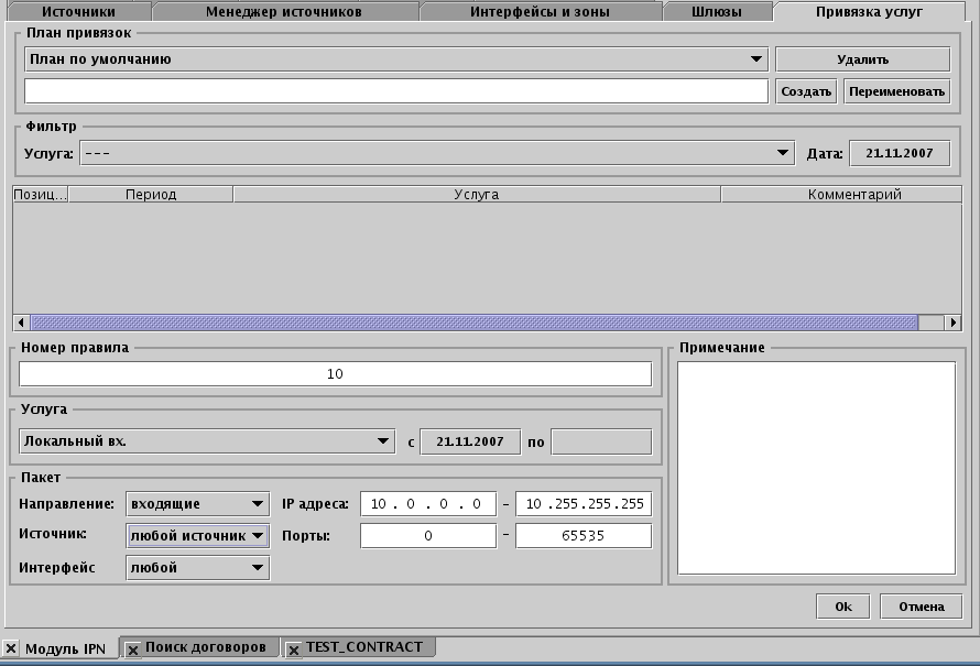 План по умолчанию нельзя ни удалить, ни переименовать. В таблице ниже отображаются привязки услуг для текущего плана привязок, редактирование осуществляется общей панелью инструментов. Кнопка открывает редактор привязки.