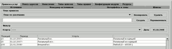 определяют принципы разделения сырого трафика из логов по услугам. Редактирование осуществляется во вкладке модуля. Каждая привязка отнесена к своему . Использование планов привязок позволяет по-разному разделять трафик по услугам для разных категорий абонентов.
