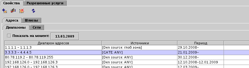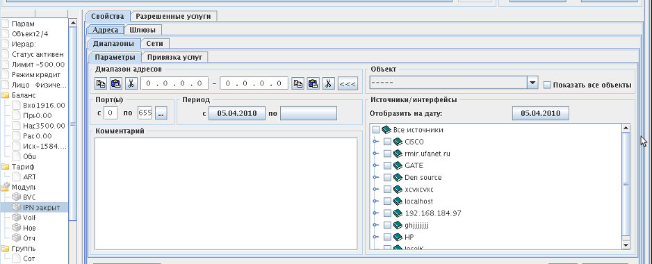 В случае, если абонент идентифицируется не по адресу, а по интерфейсу, необходимо выбрать интерфейс в дереве, а диапазон адресов установить в 0.0.0.0-255.255.255.255. Интерфейс с зоной должен быть предварительно создан на вкладке модуля.