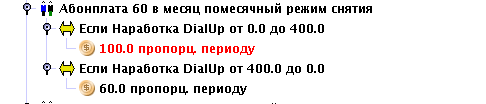 Тариф начисляет клиенту абонплату в 100 рублей в том случае, если его наработка DialUP была менее 400 рублей и 60 рублей в противном случае. Абонплата называется .