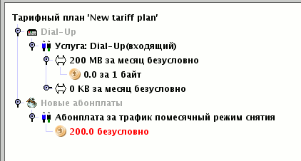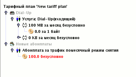 Тарифы логически связанных абонплат удобнее всего объединять в одно дерево с тарифами за услуги. Например, есть линейка тарифов DialUP с предоплаченным трафиком: 100 МБ - 100 руб, 200 МБ - 200 руб. Указаны через тире включённый трафик и абонплата за него. Создаётся услуга , одна должна присутствовать во всех договорах, использующих данный тариф. Вид тарифных планов будет следующим: