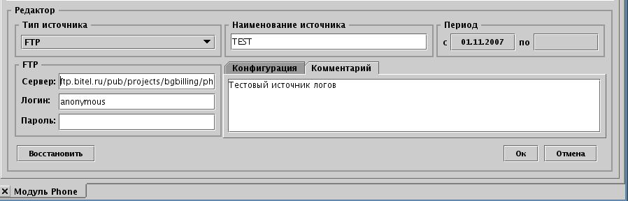 При указании FTP-источника в поле Сервер вводится DNS-имя, либо IP-адрес FTP-сервера, его порт (если не указан, берётся 21) и каталог, в котором хранятся логи данного источника.