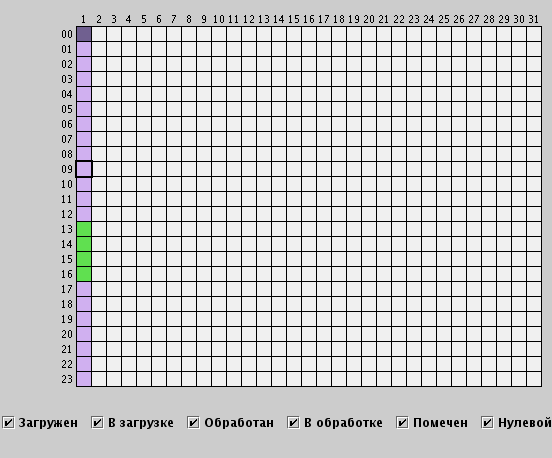 По мере загрузки логов цвет часовых квадратов будет изменяться. Загрузка логов производится случайным образом, не по порядку часов. По мере загрузки логов загрузчик логов сам добавляет задания на обработку и производит обработку логов. Обработка логов выполняется по порядку часов. Для отслеживания изменения состояний логов нажимайте кнопку панели инструментов.