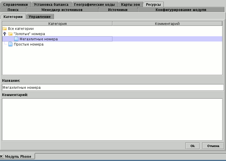позволяют произвести логическое деление всего объёма ресурсов. Например, на "Золотые" и обычные номера, либо на номера, доступные на разных АТС. Для редактирования категорий используется подвкладка Категории, для добавление категории выберите родительскую категорию и нажмите на стандартной панели инструментов.