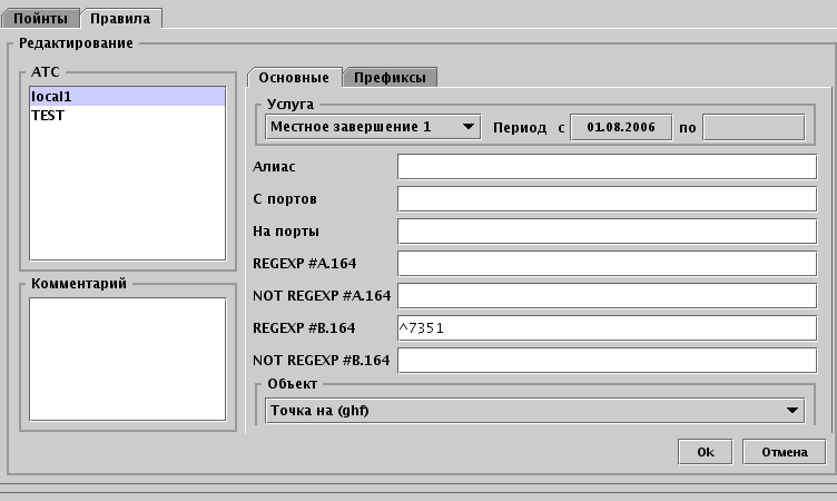 Обязательными к заполнению являются код услуги, АТС, к которой привязано правило. Период действия правила влияет на выбор правил, участвующих в обработке лога за конкретную дату. Алиас используется для ввода идентификатора правила, если алиас не введён, правило называется в виде Услуга + АТС.