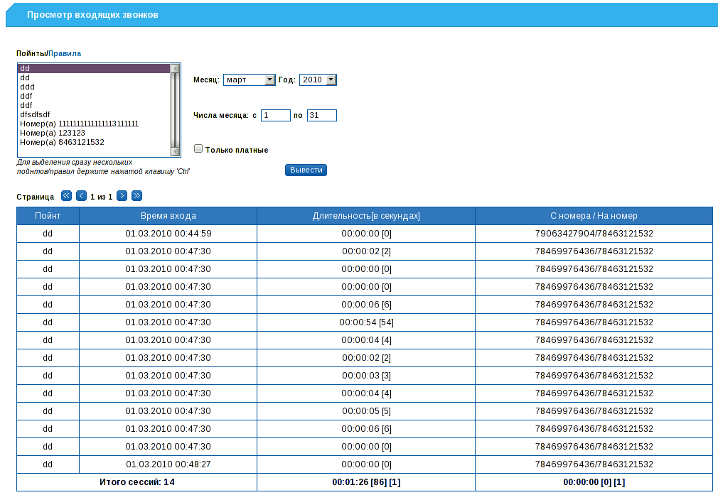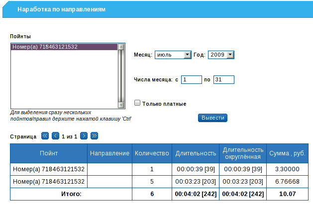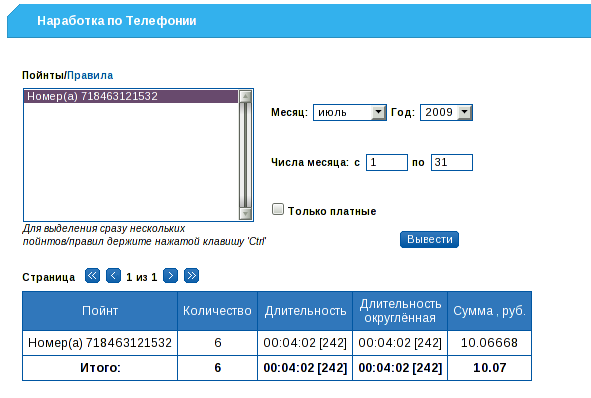 Через Web-интерфейс модуля Phone имеется возможность просмотра сессий, наработки, наработки по направлениям, наработки по услугам, детализации и входящих звонков клиента по поинтам или правилам. Используя фильтры по дате, можно просмотреть интересующие данные как за конкртеный день, так и за целый месяц.