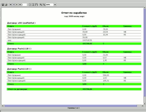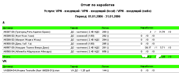 Выводит наработку с группировкой по договорам и услугам . Он имеет 2 части, вначале выводится информация по услугам для каждого договора, потом информация по услугам для всех договоров.