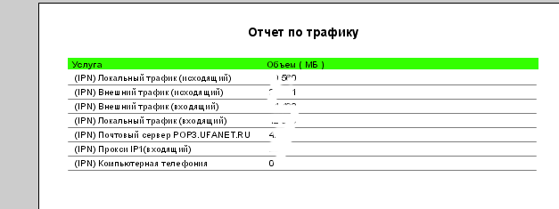 Позволяет вывести объем трафика за выбранный месяц по группам договоров. Он имеет 2 части: вначале выводится информация по услугам для каждого договора, потом информация по услугам для всех договоров.