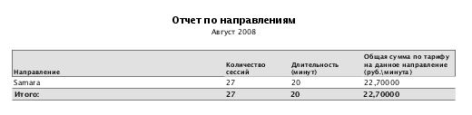 Отчет по направлениям за месяц . Для каждого направления выводится суммарное количество соединений, суммарную длительность соединений и сумму. Доступна фильтрация по услугам и группам договоров, префиксу и типу лица договора (физ.лицо, юр.лицо, все).