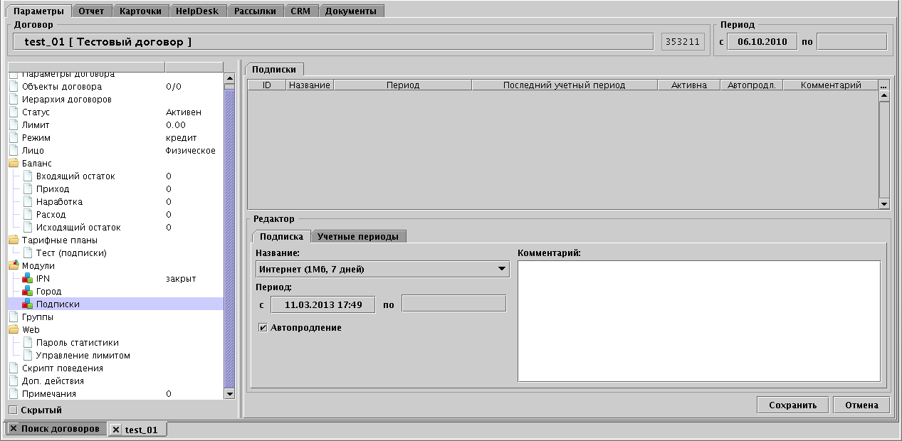 После добавления модуля к договору, необходимо добавить нужные подписки на договор. Для этого выбрать в дереве договора элемент Подписки и открыть редактор кликнув по иконке "Новый элемент" на Панели инструментов. В редакторе нужно выбрать Тип подписки, ввести период, при необходимости выставить флаг автопродления и ввести комментарий если нужно.