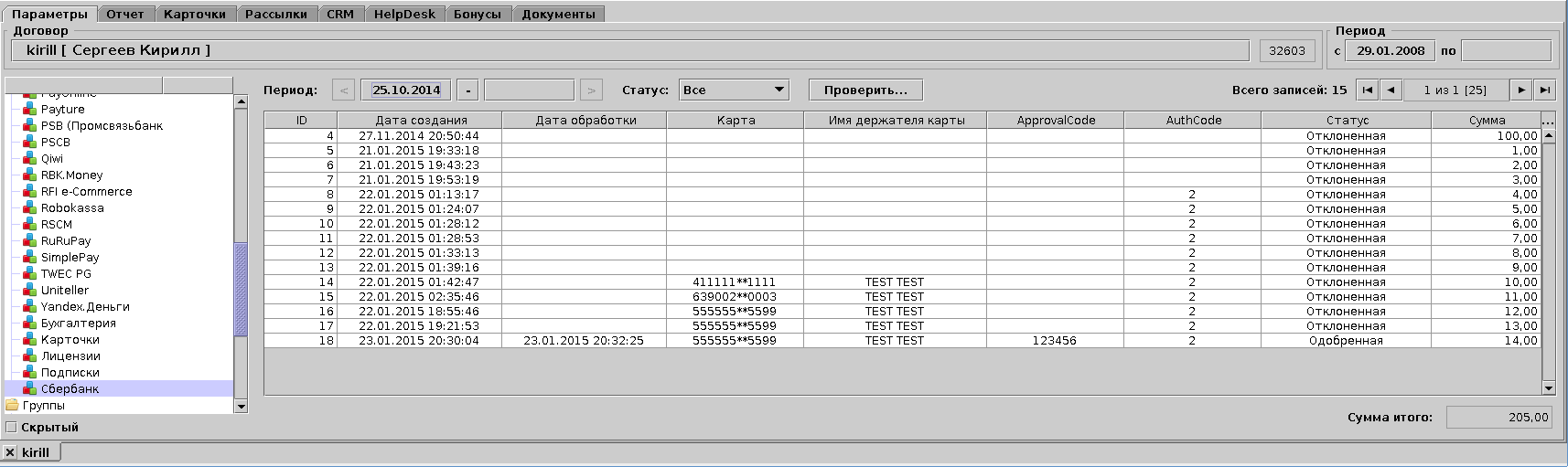 Для просмотра общего списка платежей по всем договорам в системе существует Монитор транзакций, который доступен через меню Sberbank .