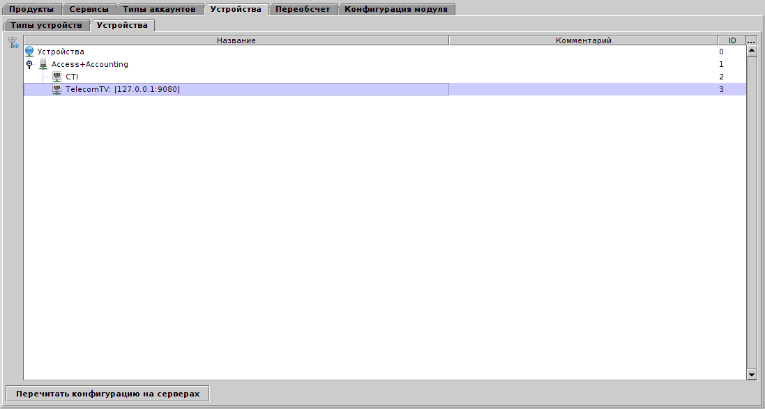 Дерево устройств состоит из корневого устройства Access+Accounting и дочернего к нему устройства-MW/CAS. Корневое устройство отражает приложения BGTVAccess и BGTVAccounting.
