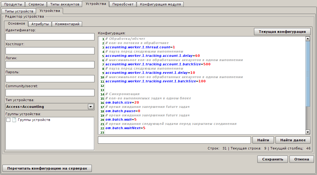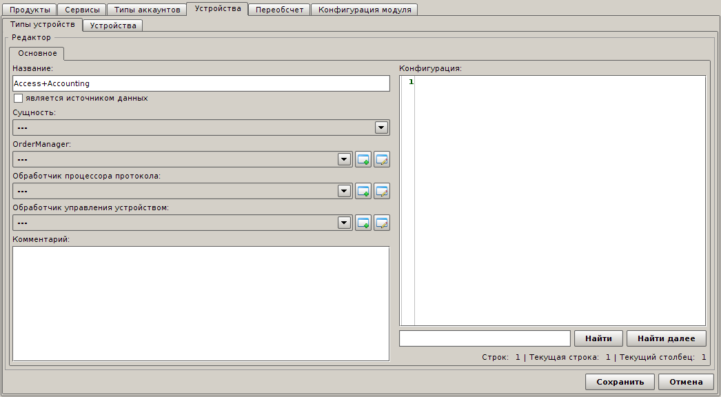 Создайте устройство типа Access+Accounting и укажите конфигурацию: