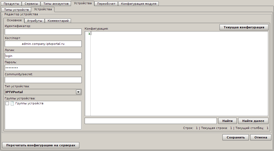 Далее создайте новый тип устройства, назовите его, например, IPTVPortal и добавьте конфигурацию:
